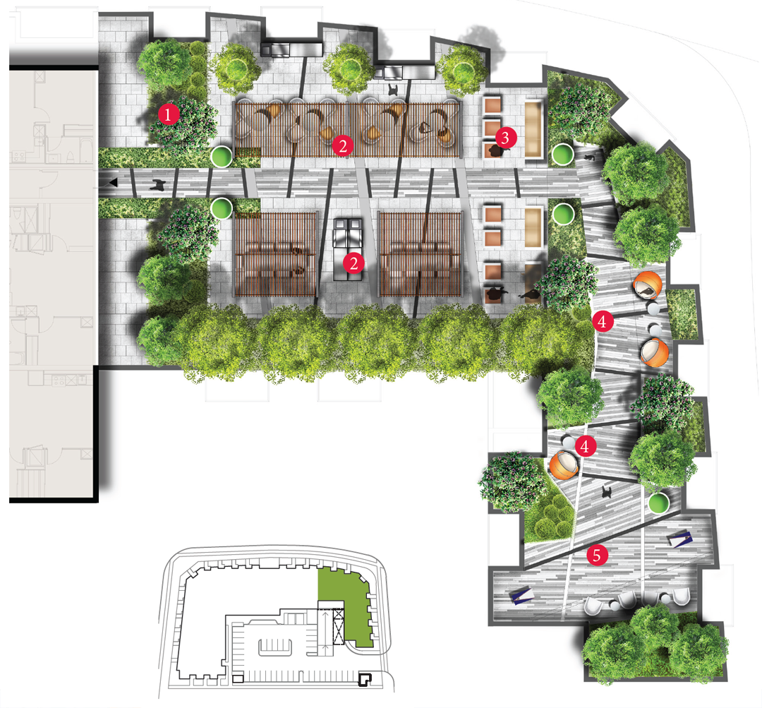 As you would expect from Plaza, first-class amenities abound in Mississauga Square. An expansive fourth floor outdoor terrace invites you outside with a dazzling, centerpiece pool. To start your day, or close it off right, slip in for a swim. Or, if you're just feeling like a bit of sun, swing lazily in your cabana's hammock; it's okay, you can put off your workout on the stateof- the-art, outdoor fitness equipment for another day. When you're ready for something more social, the third floor terrace is open to entertaining thoughts with four party rooms – that happily transform into two larger ones, should you plan for something more popular. The terrace includes BBQ cooking facilities, so everyone can get their fill. And, if you prefer some solo food for thought, a reading garden awaits quietly nearby. Convenience counts, so Mississauga Square offers you the opportunity to work alone or in small groups at charming outdoor work stations. And, when you have the need, the use of guest suites for your overnight visitors